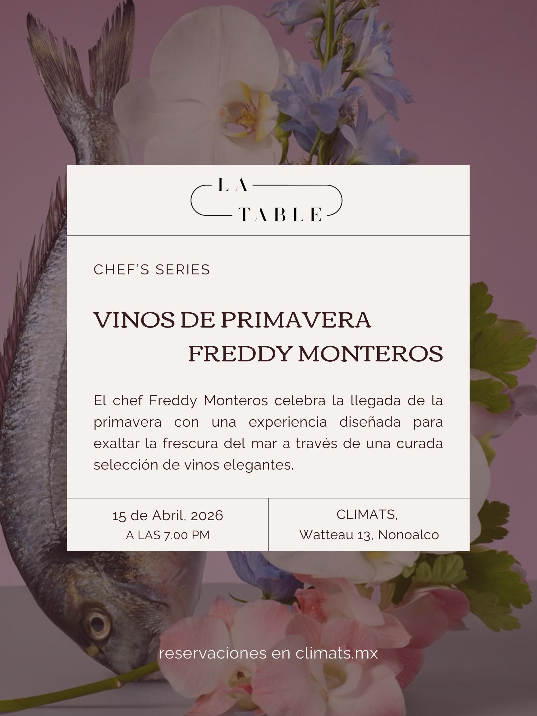 Esta cena maridaje une la cocina precisa de Freddy Monteros, centrada en mariscos de temporada y producto de mares mexicanos, con blancos, rosados, tintos ligeros y burbujas elegidos para cada tiempo.