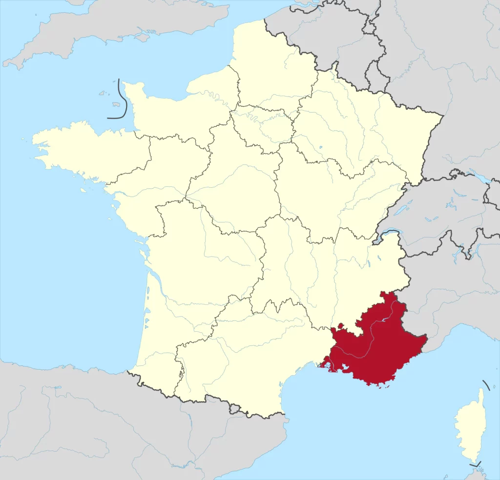 La región vinícola de Provenza se sitúa en el sureste de Francia, entre el Mediterráneo y los Alpes del sur. Los viñedos se extienden principalmente desde Marsella hacia el interior, cubriendo gran parte del departamento de Var.
