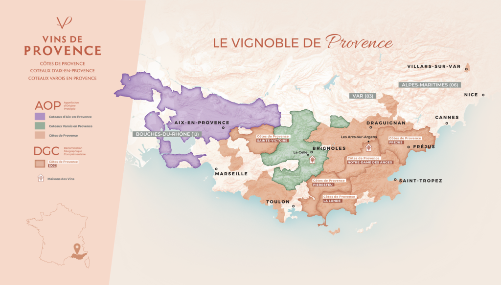 Denominaciones destacadas: Côtes de Provence, Coteaux d’Aix-en-Provence, Bandol, Coteaux Varois en Provence